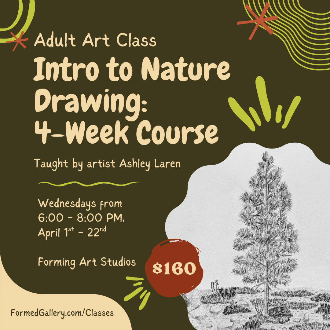 Discover the beauty of the natural world through drawing in this 4-week drawing course geared towards beginner-level adults with some drawing experience. Led by artist Ashley Laren, this class will go through drawing fundamentals with graphite, while also teaching techniques on how to capture natural textures, features, and landforms. Participants will gain hands-on practice through guided instruction to help unlock their creative potential in drawing the natural world.