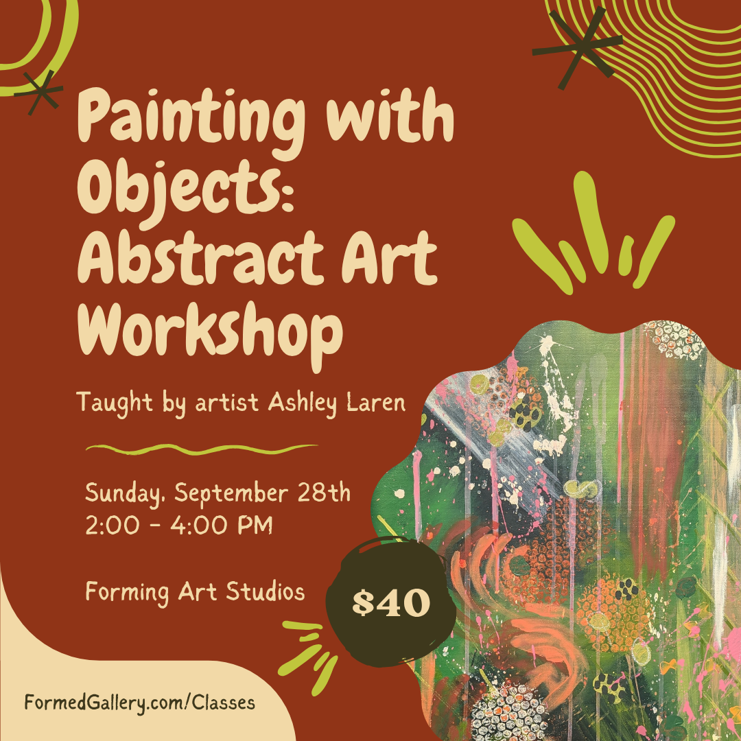 In this one day only art workshop, artist Ashley Laren will be guiding you through a journey to unleash your creativity and explore the world of creating abstract artwork. Throughout this event, participants will experiment with using unconventional materials (like pool noodles, cardboard, and bubble wrap) to apply paint, texture, and movement to the canvas. No prior art experience is necessary; this workshop is designed for beginners and beyond, eager to dive into the world of abstract art and painting with unconventional materials.